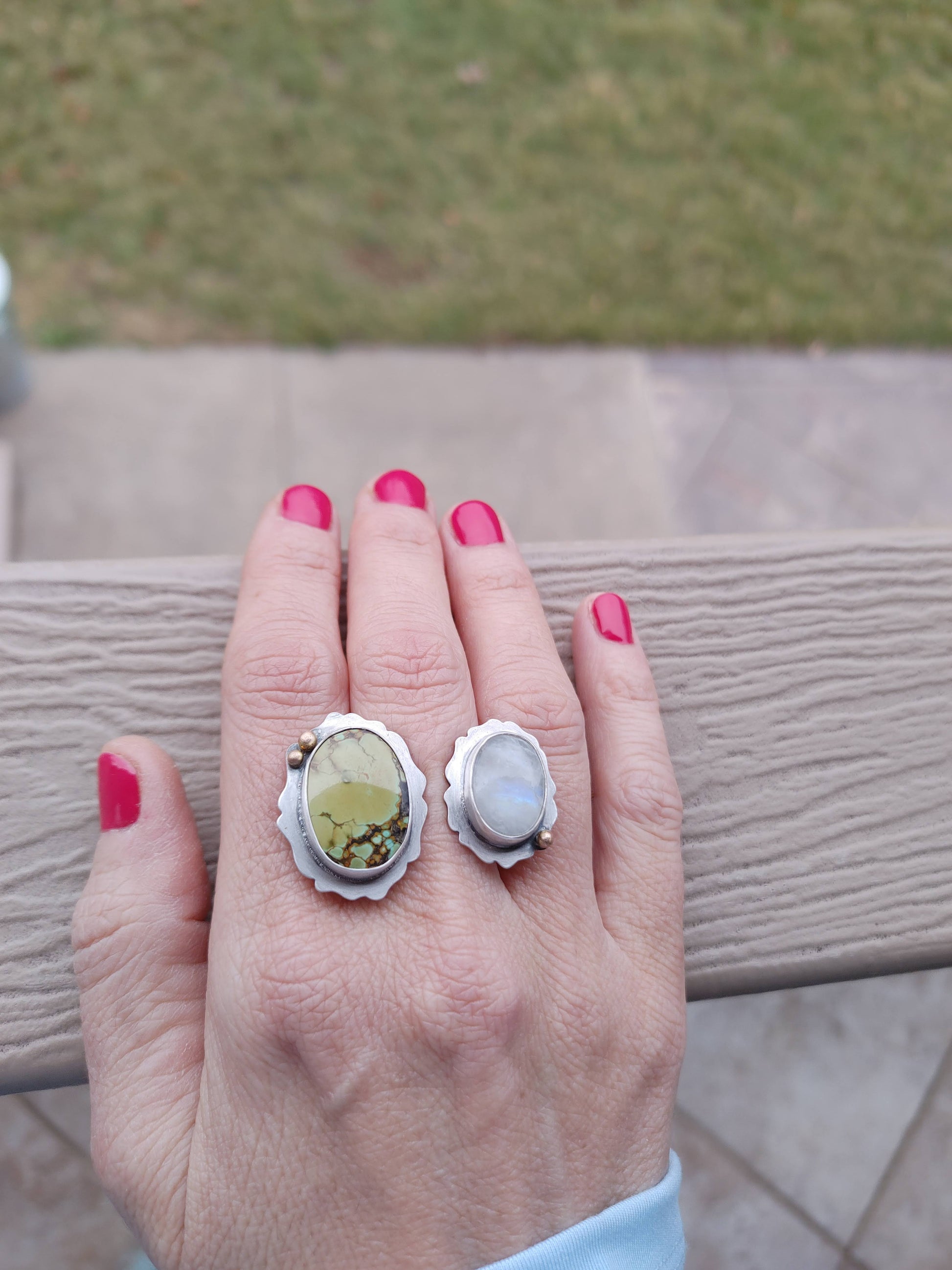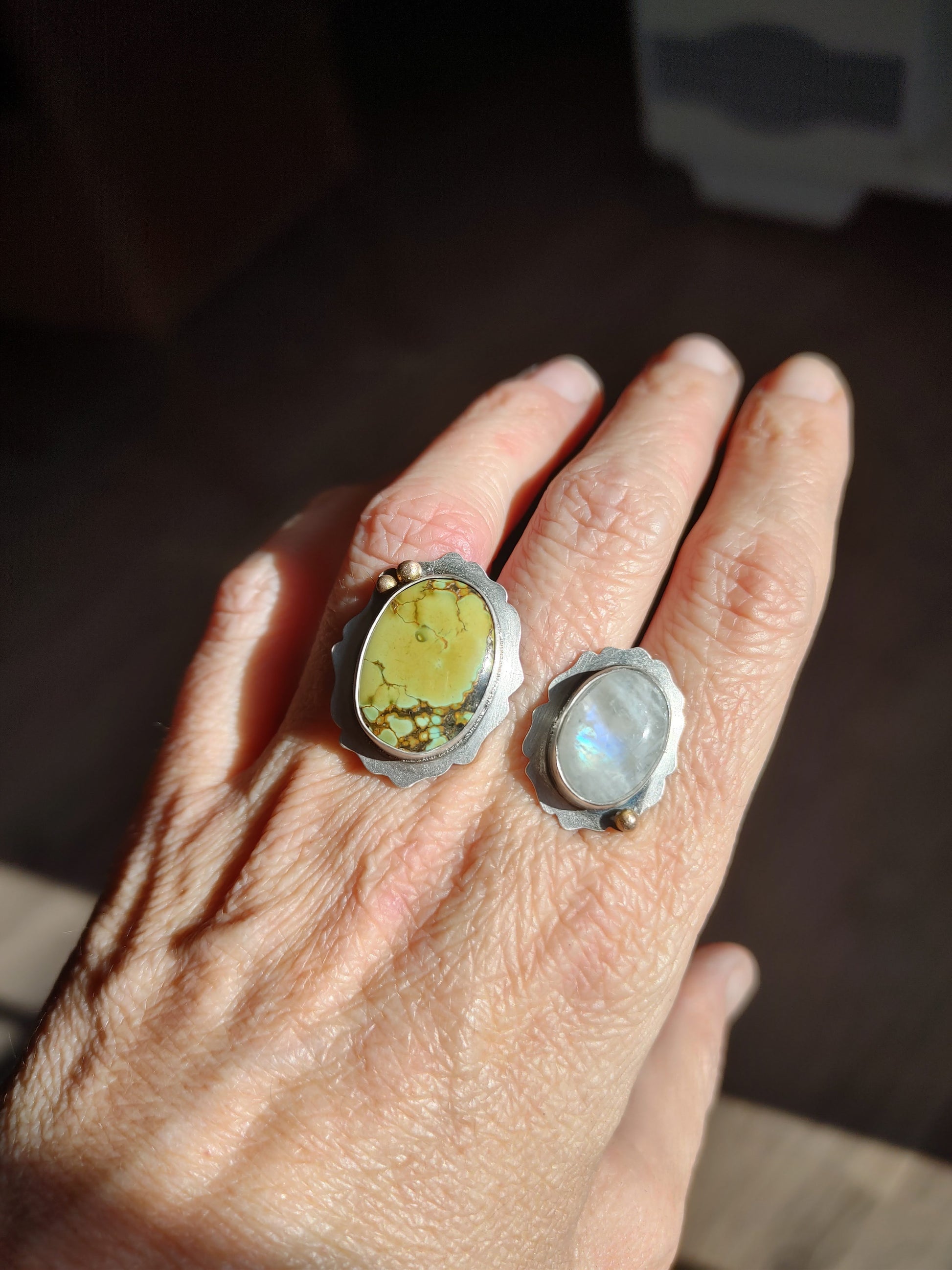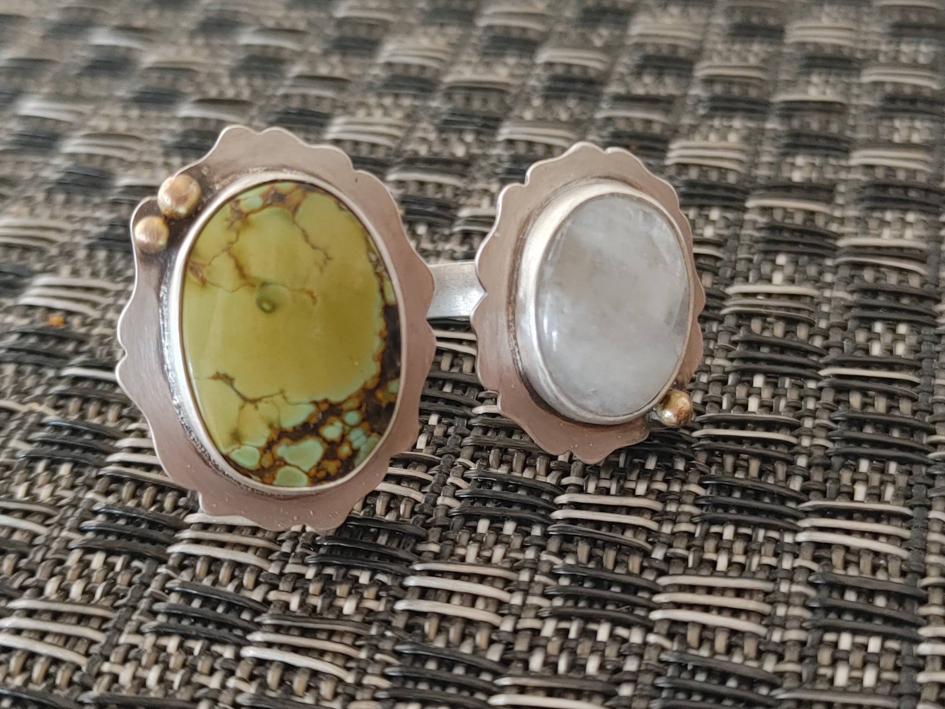 Very unique handmade ring with Treasure Mountain Turquoise and Rainbow Moonstone. Set in sterling silver and 18K yellow gold accents.
