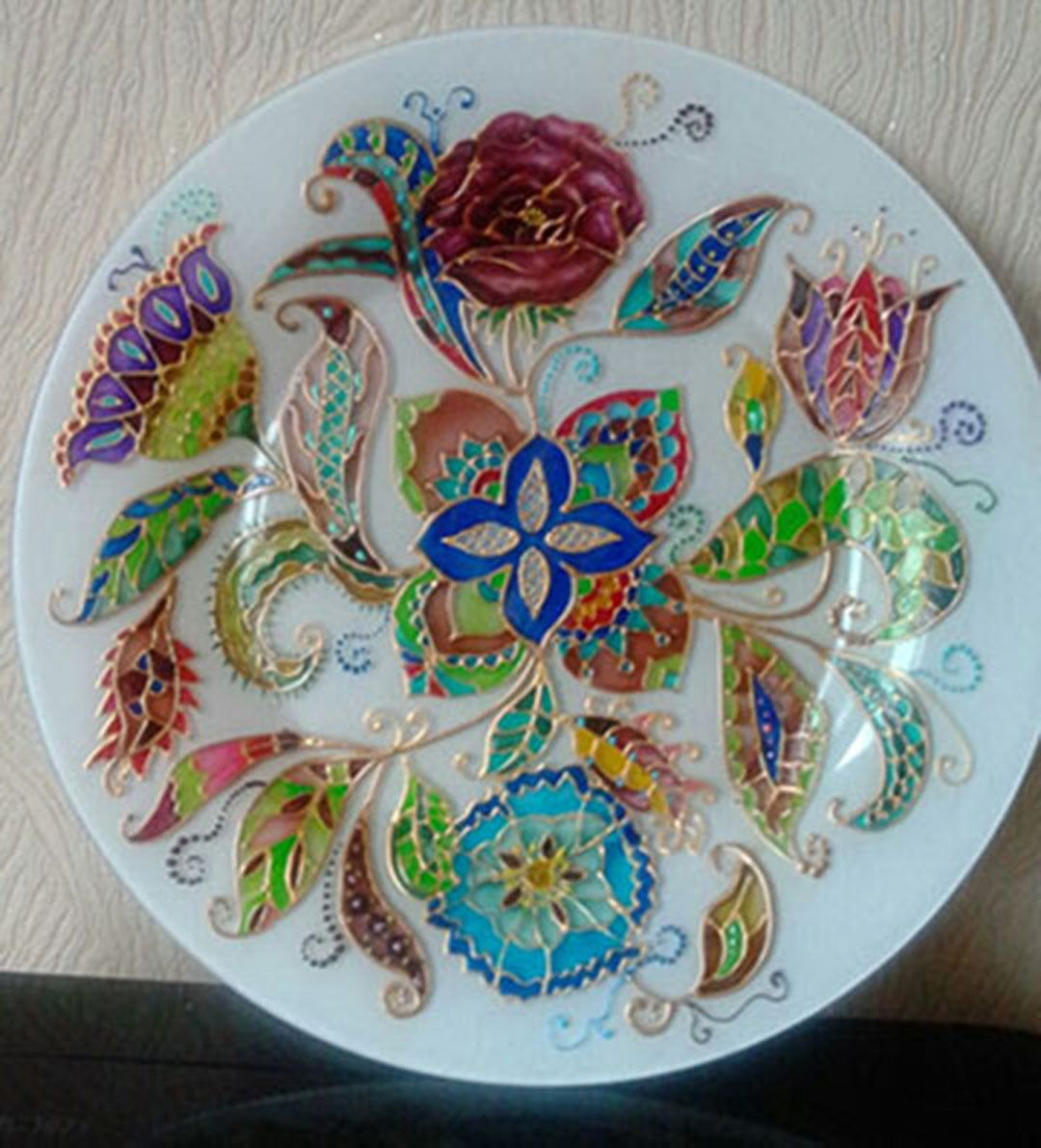 Decorative ceramic plate is painted by hand with acrylic paints and acrylic contours.