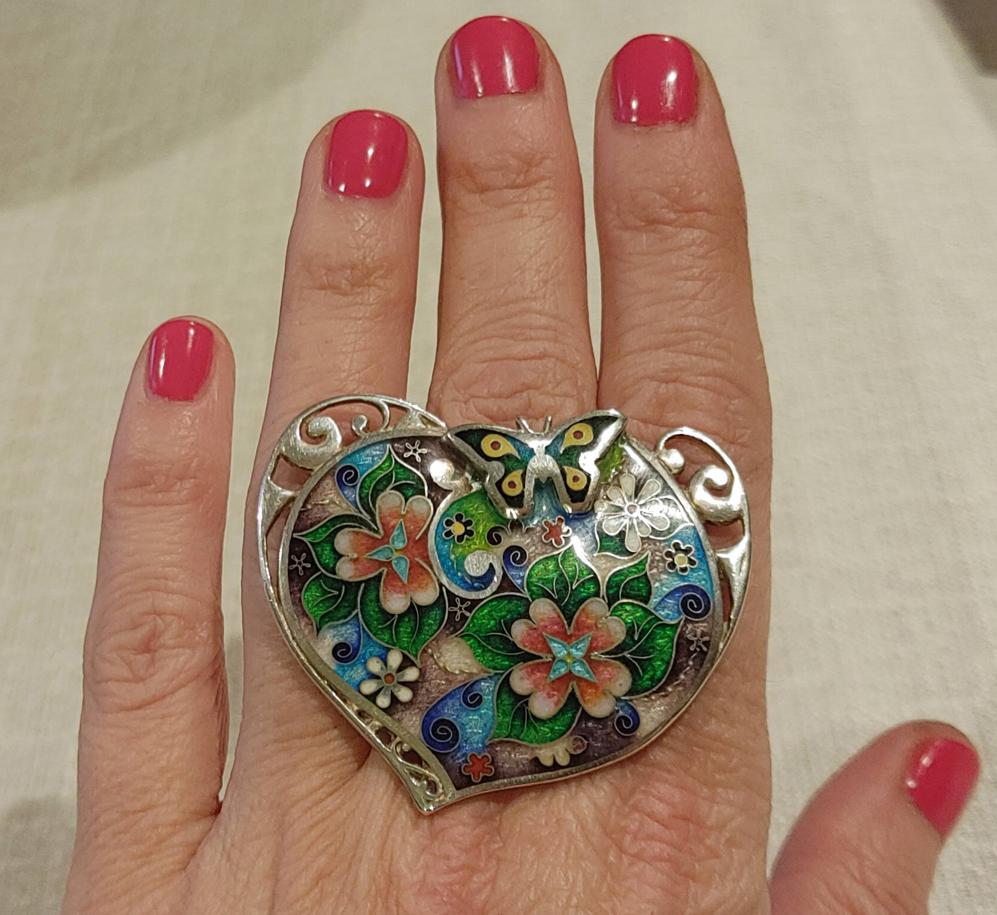 Handmade Cloisonne Enamel Butterfly and Flowers Ring Size 6
